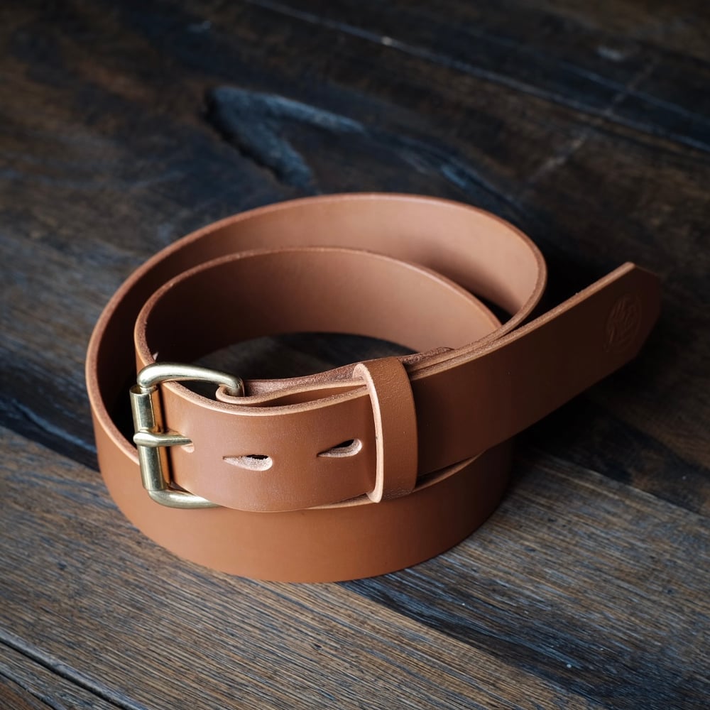 This heavy duty 4,5mm/11oz thick and 38mm wide belt is made from Old English Bridle. The roll buckle is solid brass as well as the Chicago crews.